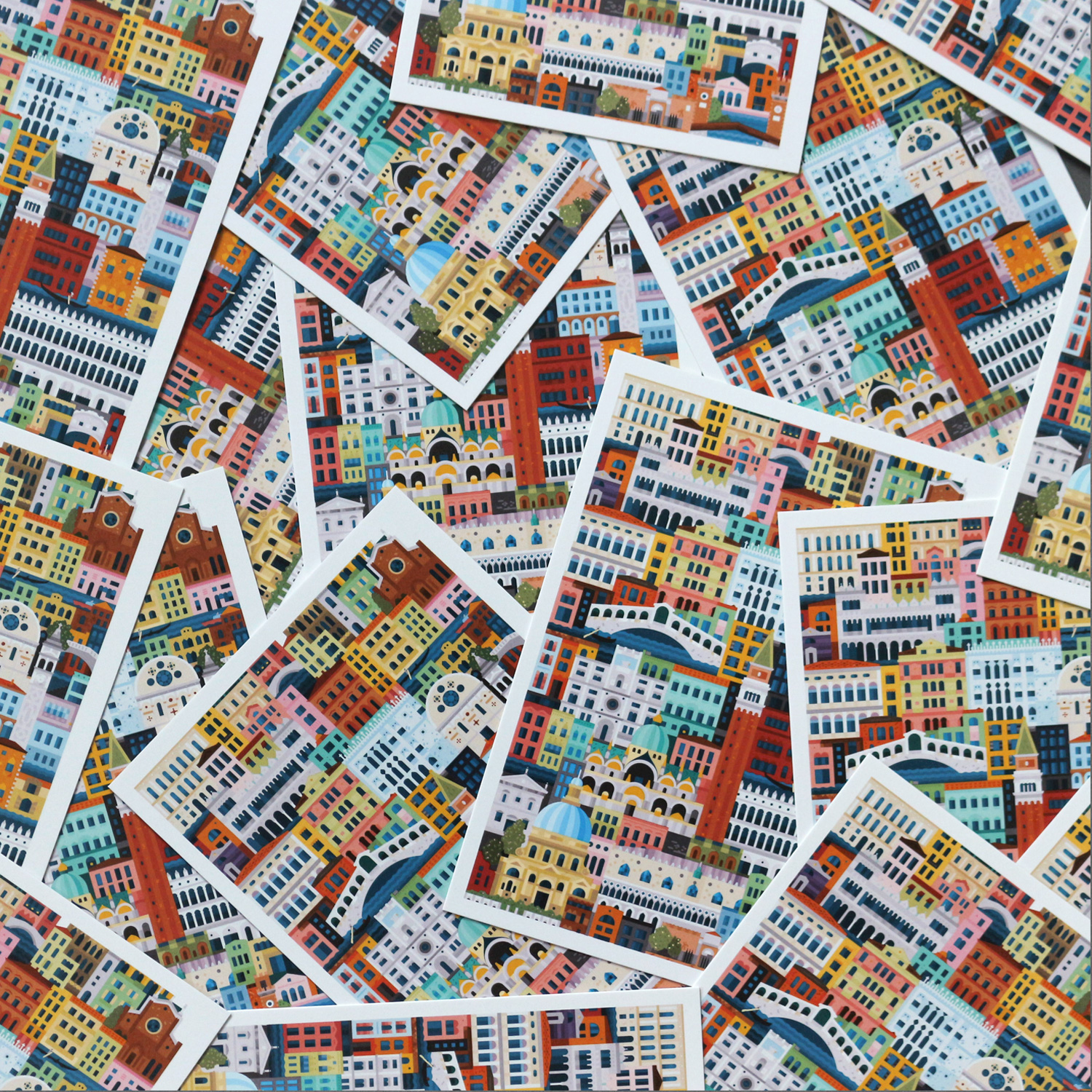 Venice postcard set of 6, featuring our detailed, colourful Venice drawing. Includes the Rialto Bridge, Doge’s Palace, and St. Mark’s Square